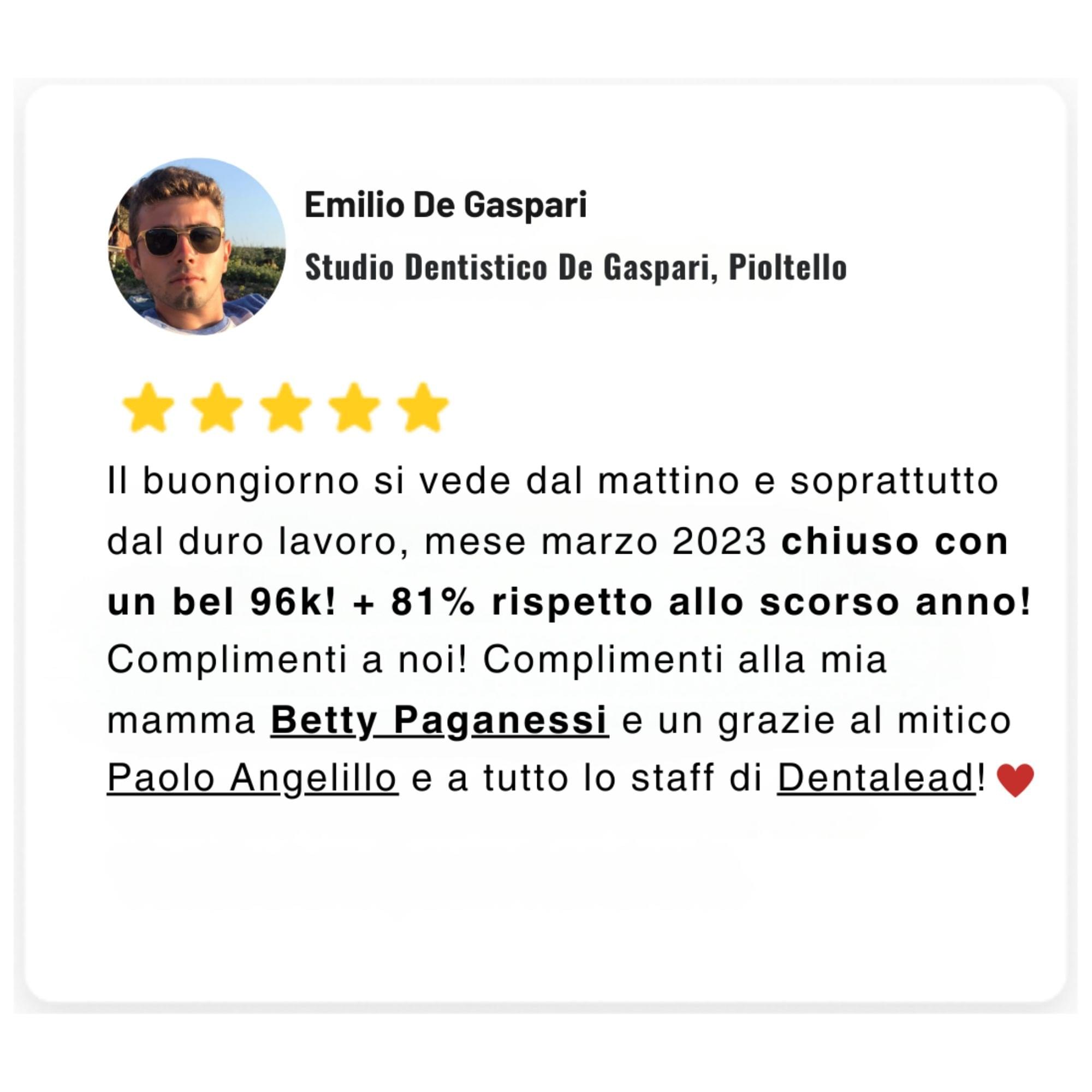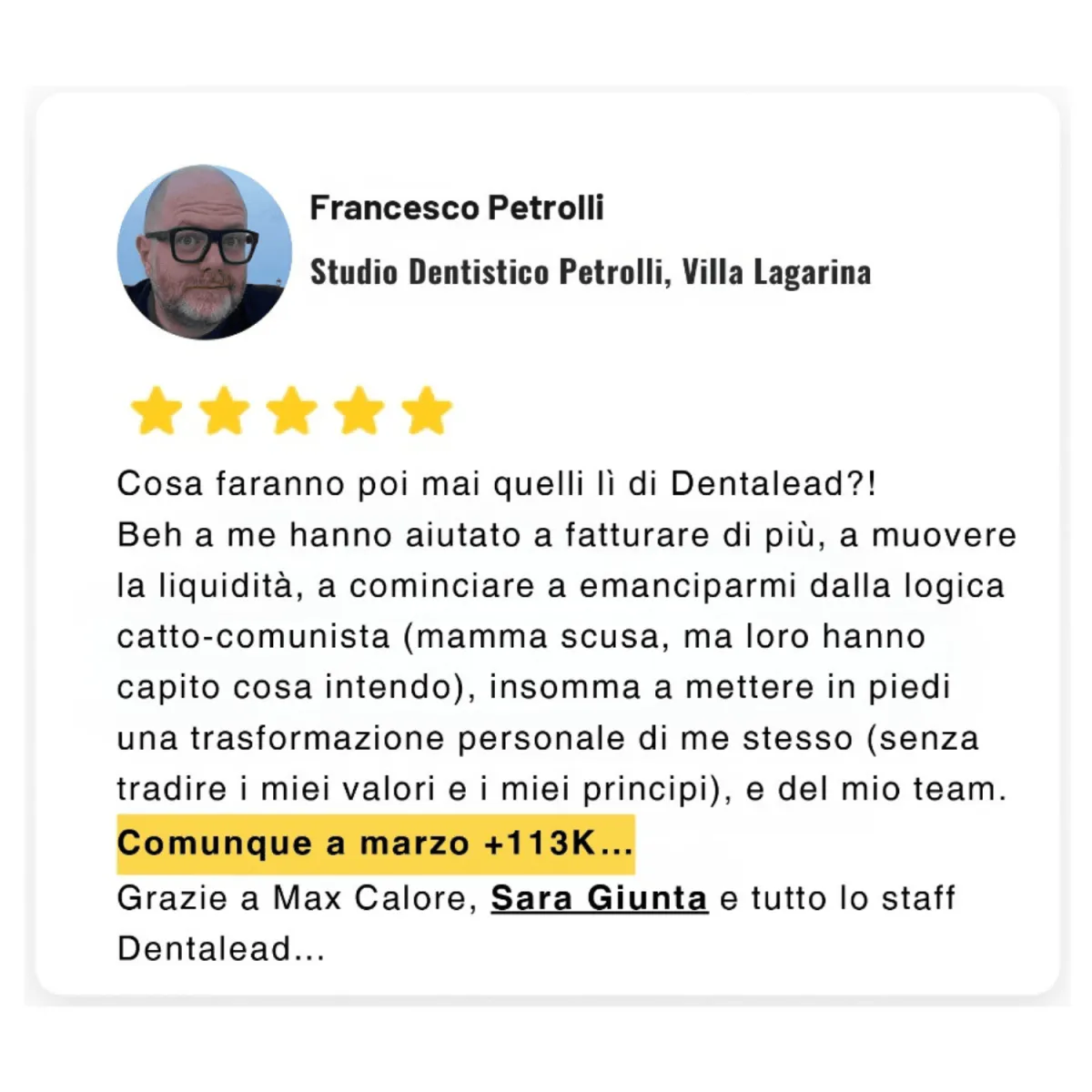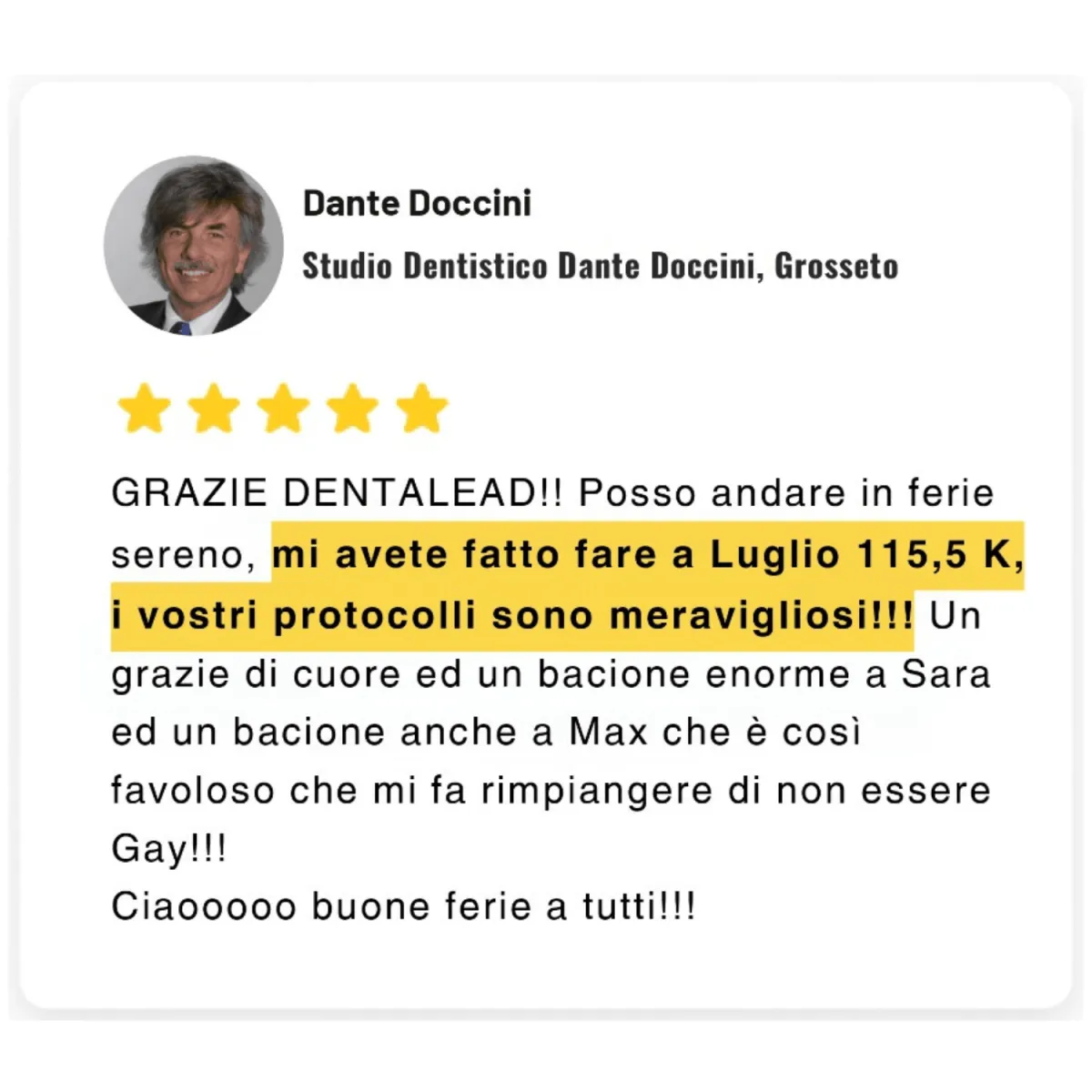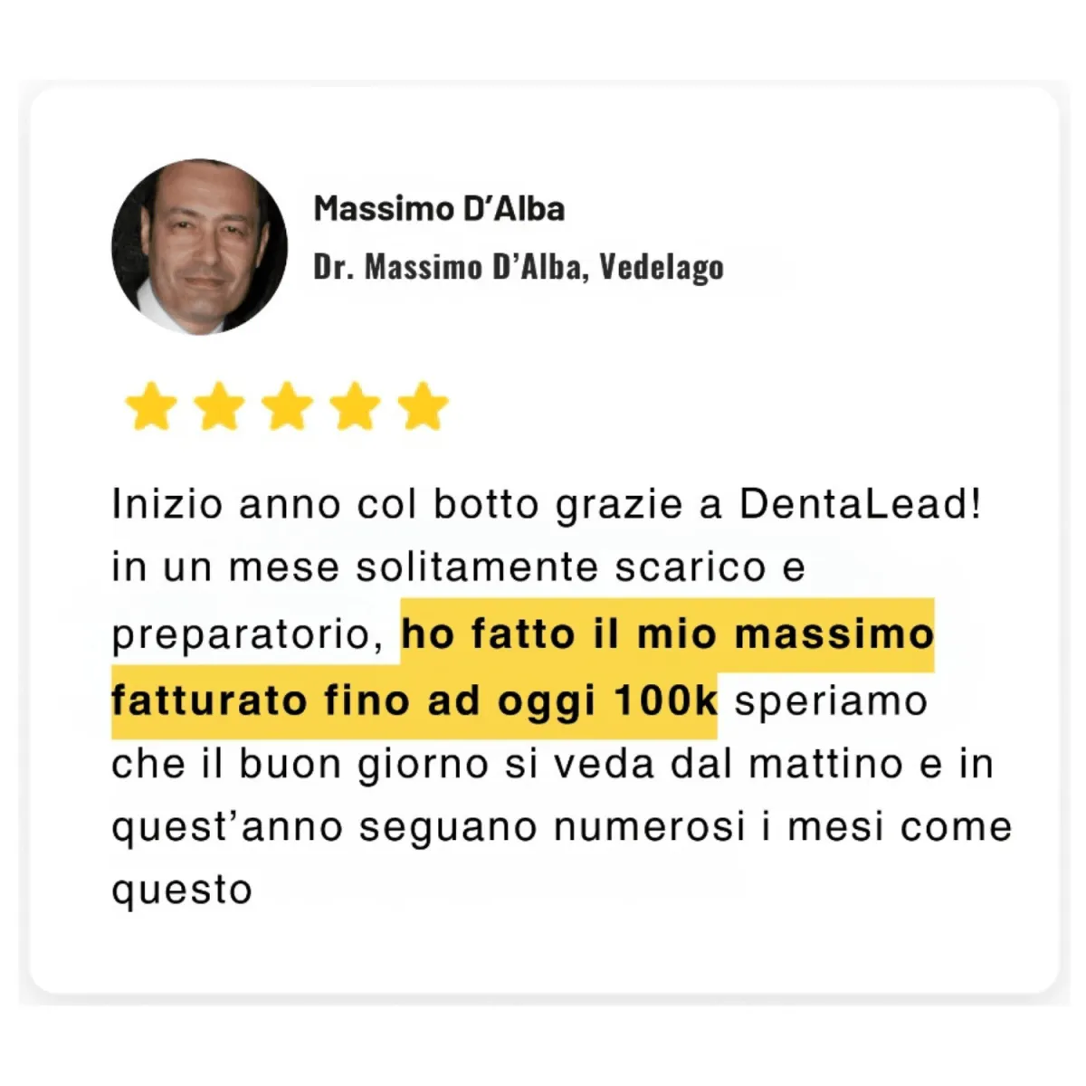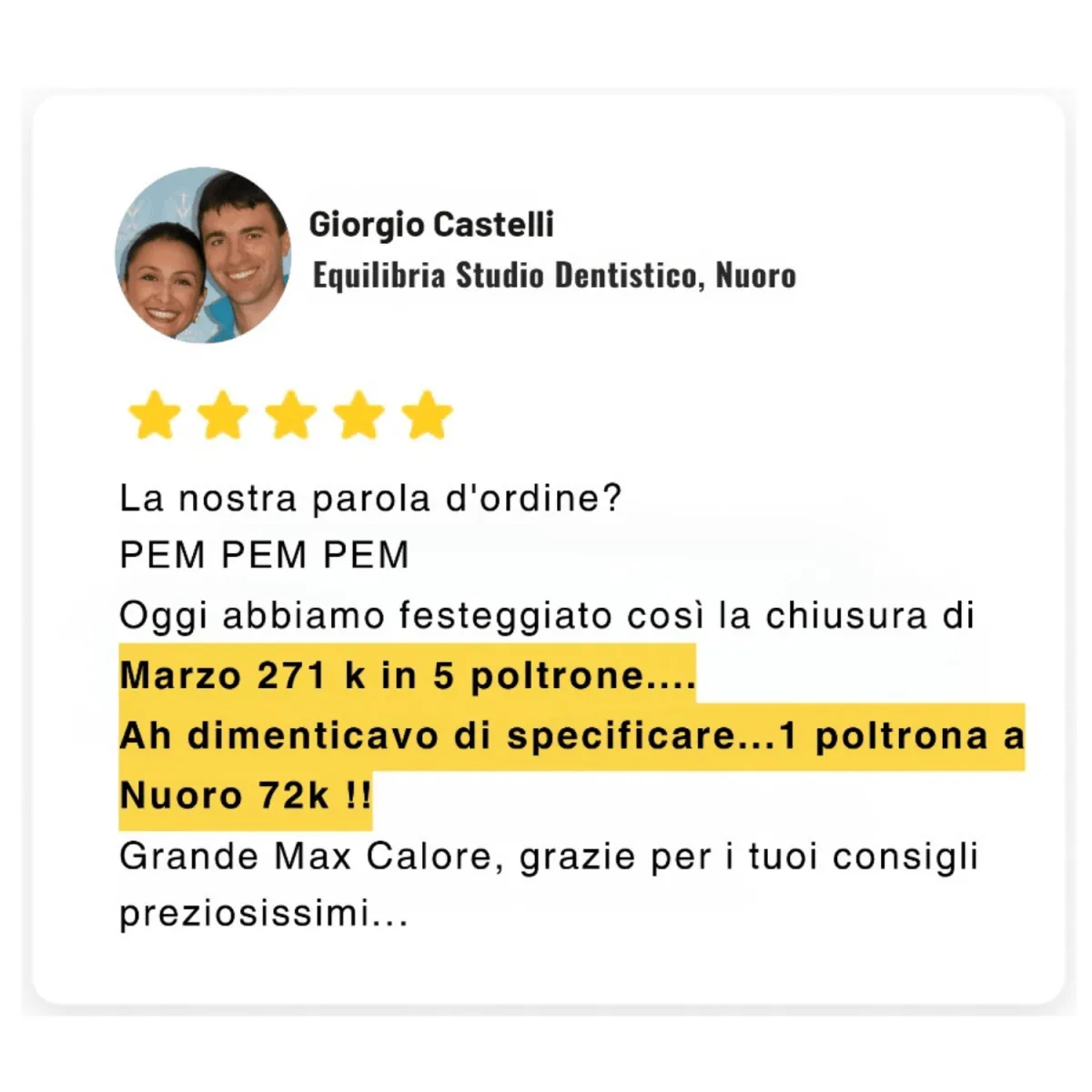 I miei clienti hanno ottenuto risultati così delegando il 75% del loro lavoro a collaboratori che si ripagano da soli, eliminando le inefficienze del loro studio e installando un sistema di marketing che fa leva sui loro già pazienti soddisfatti.