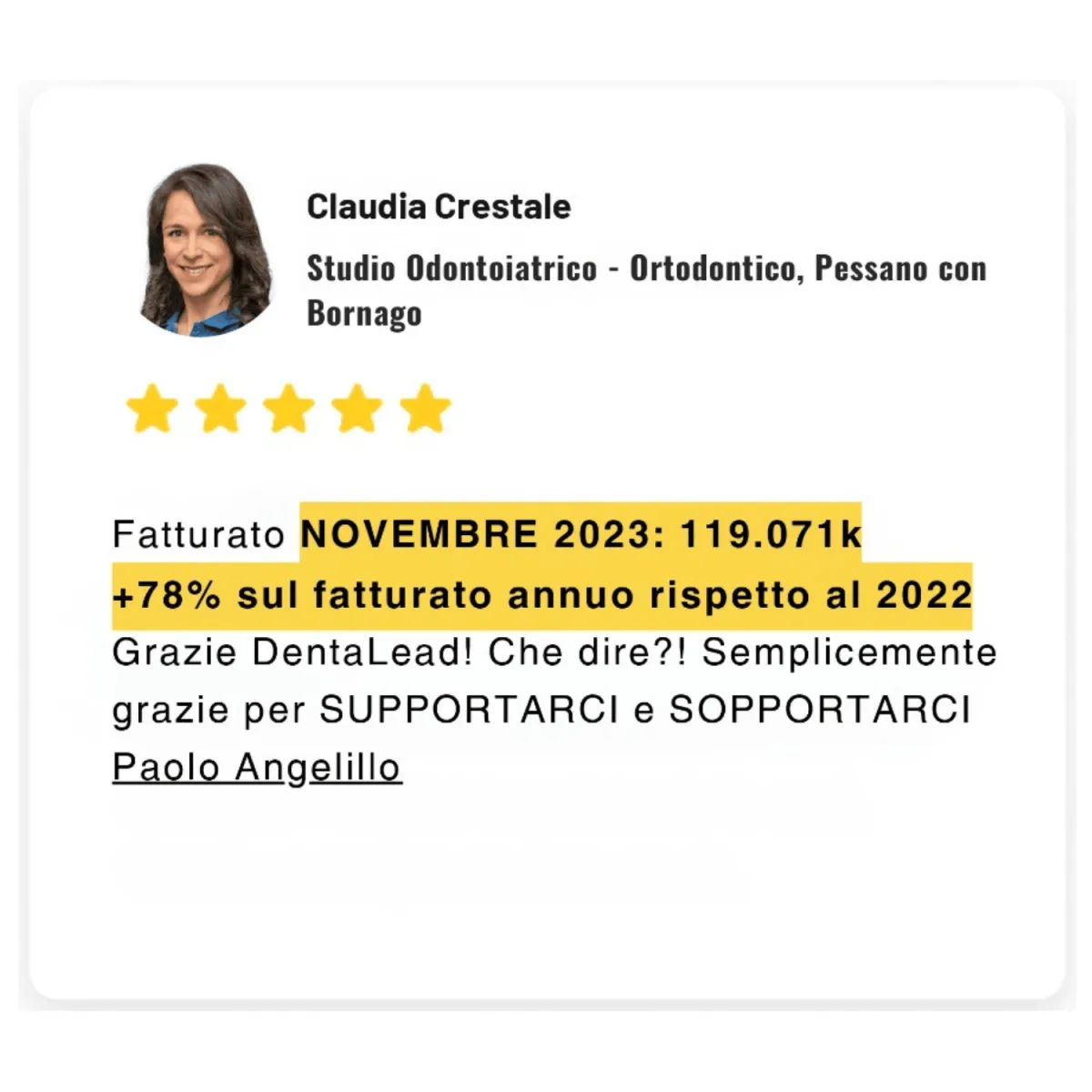 Aumenta il fatturato del 49% senza lavorare più ore – scopri il metodo che trasforma ogni paziente in un promotore del tuo studio (senza spendere soldi in pubblicità) e, tra l’altro, funziona anche se hai già provato altre strategie e fallito…